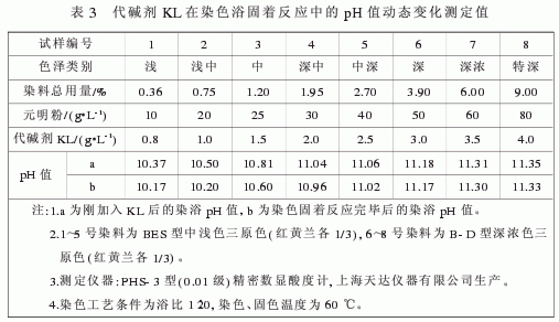從pH值反映的表觀現象來看,由于強堿調節pH值的敏感性,似乎代堿劑的用量一般可以是純堿的1/10左右。但從活性染料的染色特征和代堿劑的組成相結合來看,代堿劑KL在染色中的化學作用原理和對pH值動態變化的影響機理,與純堿有著相當大的區別。所以,不應簡單地以一個比例參數來作深、中、淺色的統一換算。