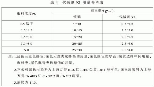 經反復染色試驗后進行匯總,代堿劑KL的最高用量4 g/L,而最低用量不能低于0.8 g/L,這是染色浴固著反應所需的pH值最低限。代堿劑KL的使用量與純堿的換算,見表4。