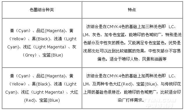 羊毛及羊絨類的數碼噴射印花一般采用活性染料,目前Dystar的活性染料的基礎色有青(Cyan)、品紅(Magenta)、黃(Yellow)、黑(Black)、淺清(Light Cyan)、淺紅(Light Magenta)、灰(Grey)、大紅(Red)、寶藍(Blue)。但數碼噴射印花機目前最多只能用8種顏色,用戶可以根據需求選擇不同的組合: