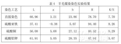 K/S值越大染色效果越好, 通過以上數(shù)據(jù)分析,K/S羊毛染色工藝媒染均能起到較好的媒染效果,硫酸銅和硫酸鋁鉀媒染起到了增強色深的效果。硫酸亞鐵在增強色深的同時, 發(fā)生了色調(diào)的變化, a、b值逐漸降低,且a值出現(xiàn)負(fù)值,即由紅光轉(zhuǎn)為綠光。