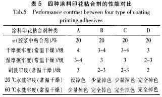 采用相同的配方制備紡織印花膠漿(僅交聯(lián)劑不同),然后在相同條件下(常溫干燥24h)對印花產品進行性能測試,則四種涂料印花粘合劑的性能對比如表5所 示。其中A為常溫交聯(lián)單體LEG合成的涂料印花粘合劑,B為丁氧基丙烯酰胺低溫交聯(lián)單體制成的涂料印花粘合劑,C為水性丙烯酸酯和PU接枝聚合而成的涂料 印花粘合劑(PUA),D為~一羥甲基丙烯酰胺為交聯(lián)單體的涂料印花粘合劑。