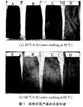 由表5可知,在常溫干燥24h的情況下,A性能最好、D性能最差。這是因為D中的Ⅳ一羥甲基丙烯酰胺為高溫交聯(lián)單體,它只有在l50~170℃焙烘后才能 完全交聯(lián)成膜;因此,在室溫干燥的情況下D很難達到交聯(lián)成膜,其印花產品的牢度自然會受到影響。B和C只有在80~100℃焙烘后才能完全交聯(lián)成膜,而在 室溫干燥的情況下只能部分交聯(lián)成膜,因此,其印花產品的牢度比D好。A是用常溫交聯(lián)劑制備的印花粘合劑,在常溫干燥的情況下就能達到完全交聯(lián)成膜,因此, 其印花產品的各項性能最好(見圖1)。