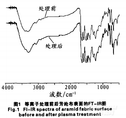 i 為了進一步了解低溫等離子處理前后芳綸布表面基團蠻 的變化情況,對處理前后的芳綸布進行了FT—IR分析,見圖1(等離子處理時間為1 0 min)。