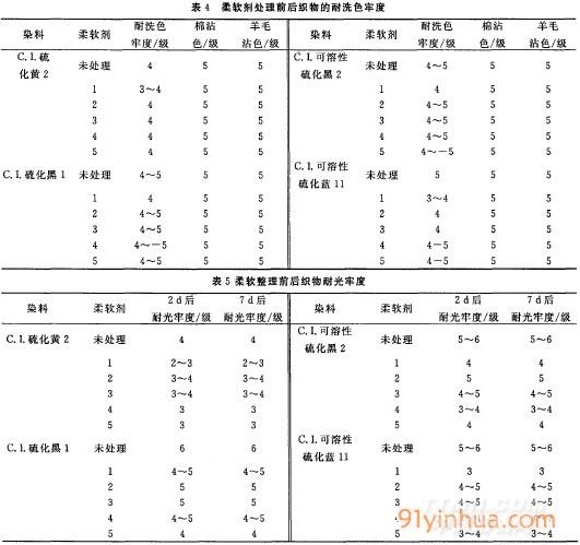 從表4可以看出,C.I.可溶性硫化藍l1的水洗牢度有所下降,這是因為柔軟劑的使用改變了染料和纖維之問的分子健,導(dǎo)致染料從織物表面移出而致.但是其它硫化染料經(jīng)柔軟整理后水洗牢度沒多少下降,所有染色樣品柔軟整理后在棉沾色和羊毛沾色上都沒有改變.