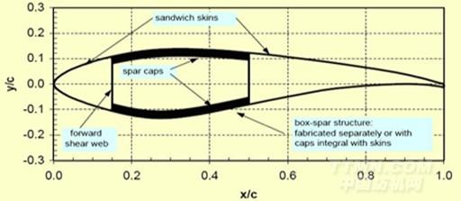 在風力發(fā)電領(lǐng)域,經(jīng)編復(fù)合材料是制造風力發(fā)電葉片及其它重要結(jié)構(gòu)部件的主要材料,葉片90%以上重量由復(fù)合材料組成。采用碳纖維NCF織物制備的復(fù)合材料風機葉片,具有質(zhì)量輕、強度高、剛性好的優(yōu)點,能夠滿足開發(fā)大型化、輕量化、高性能、低成本的發(fā)電葉片的要求,如圖3所示為風機葉片,圖4為葉片結(jié)構(gòu)。
