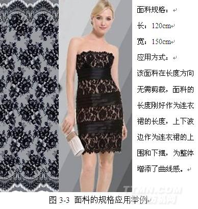 睫毛花邊面料一經(jīng)設(shè)計(jì),其幅寬和長度都是確定的。因此睫毛花邊面料在設(shè)計(jì)時需要充分考慮其用途。根據(jù)睫毛服裝面料的應(yīng)用方式不同,睫毛服裝面料的規(guī)格設(shè)計(jì)也不同,主要是長度差異較大。比如,用于領(lǐng)子或袖口的睫毛面料,長度只需5-10cm,也稱為裝飾用睫毛花邊面料。當(dāng)睫毛花邊作為單獨(dú)的上裝面料或下裝面料,如吊帶衫、半身裙時,睫毛花邊的高度一般根據(jù)服裝的長短設(shè)計(jì),一般在30-60cm,剛好能夠充分利用睫毛花邊的上下波浪式睫毛邊,長度方向無需太多裁剪。作為裙子套裝或連衣裙的睫毛花邊,長度則需要滿足服裝的規(guī)格要求,一般在100-130cm之間,應(yīng)用方法如圖3-3所示。睫毛花邊面料制作連衣裙時,面料的長度即是裙子的長度,上下睫毛邊分別為裙子上圍和下擺,制作簡單。而制作套裝群時,只需將睫毛花邊面料上下對裁,一分為二,兩個睫毛邊分別作為上衣下擺和短裙下擺。