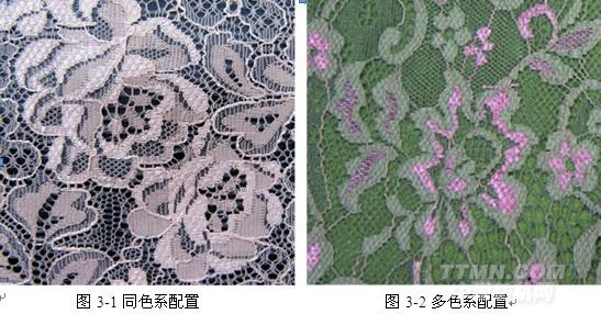 多梳拉舍爾服裝面料的多色系配置就是利用不同種類的原料染色性能不同這一特點(diǎn),在多梳拉舍爾服裝面料的生產(chǎn)過程中,采用多次染色的方法,使染色后的花邊呈現(xiàn)不同的色彩層次。如圖3-2為多色系配置效果。多梳拉舍爾服裝面料中常用的原料有錦綸、滌綸、粘膠、棉纖維等。錦綸使用酸性染料,常溫常壓染色;滌綸使用分散染料,高溫高壓染色;粘膠和棉纖維是天然纖維,采用直接染料,常溫常壓染色。