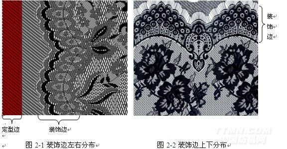 定型邊是分布在面料的最外側(cè)左右兩邊,坯布拉幅定型時起加固作用的結(jié)構(gòu)。裝飾邊會跟面料主體花型一起應(yīng)用于服裝制作中,而且會著重突出其特點(diǎn);定型邊只是在坯布定型階段起到連接、加固的作用,在面料裁剪、制作服裝的過程中就被剪掉了。有些面料只有定型邊,有些面料裝飾邊和定型邊都有,但是每幅面料一定要有定型邊,否則在坯布定型時,面料容易被拉壞。因此裝飾邊分布在上下位置的多梳拉舍爾面料,其左右還有兩個定型邊,整幅面料呈矩形狀。