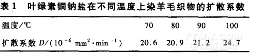 從圖1可看出,在染色初始階段上染量迅速上 升,隨著染色時間的延長,上染量的上升趨緩, 120 min后,上染基本趨于平衡。這是由于在染色的 初始階段,羊毛纖維上沒有任何葉綠素銅鈉鹽分子, 葉綠素銅鈉鹽能很快地吸附到纖維表面,因而上染 速率較大;而隨著染液中葉綠素銅鈉鹽的質量濃度減小,上染過程的推動力有所減小,同時,葉綠素銅 鈉鹽的吸附過程也不僅僅是表面作用,染料分子開 始沿纖維的孔隙向內部遷移、擴散,內擴散成為吸附 速率的控制步驟,因而上染速率下降;到上染后期, 染液中葉綠素銅鈉鹽的質量濃度越來越小,至濃度 推動力趨近于零,吸附也漸漸趨近平衡。 在染色溫度70~100 oC范圍內,隨著染色溫度 的提高,葉綠素銅鈉鹽上染羊毛織物的平衡上染量 隨之增大,這是因為在較低溫度條件下,纖維膨脹程 度較小,染料難以擴散進入纖維內部;隨著溫度的升 高,纖維膨脹程度增加,微隙增大,染料分子的熱運 動加快,因而有更多的染料分子擴散到纖維內部,提 高上染量。表1為葉綠素銅鈉鹽在不同溫度上染羊 毛織物的擴散系數。