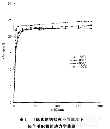 圖1為葉綠素銅鈉鹽在不同溫度下染羊毛織物的動力學曲線。