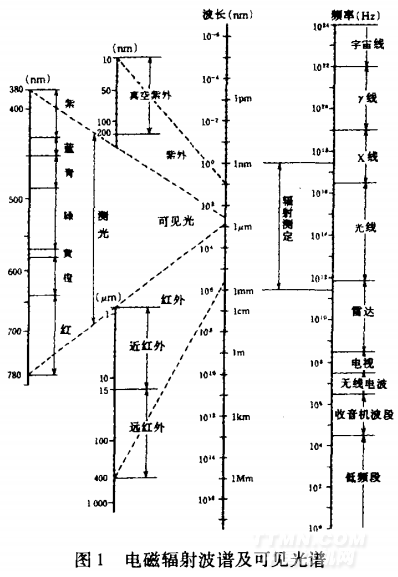 光是一種電磁波。電磁波的波長范圍寬廣,低至1 nm以下,高達10 km以上。其輻射類型包括宇宙射線、x射線、紫外線、可見光、紅外線、雷達、無線電和電視廣播、交流電等(如圖1