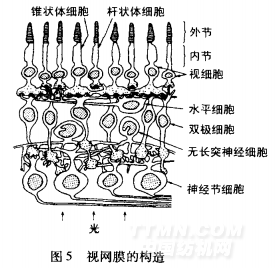 圖5中,入射光沿圖中箭頭方向射人,到達具有感光性能的視細胞;視細胞層的表側是視神經層,它由水平細胞、雙極細胞、無長突神經細胞、神經節細胞等組成,由視神經層處理來自視細胞的信號。因此,入射光是通過透明的視神經層后才到達視細胞層的。