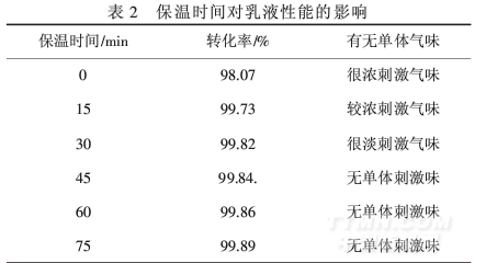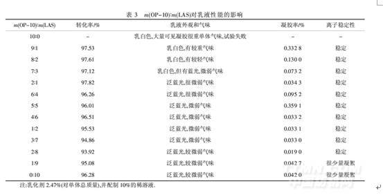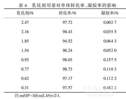 由表3可知,當m(OP-10)∶m(LAS)=2∶1時,轉化率很高,凝膠率很低,故選擇此比例為乳化劑配比.