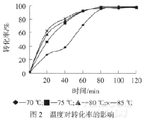 由圖2可知,溫度太低聚合反應速度較慢,反應不完全,80℃時總體轉化率達到較大值.繼續升高溫度,轉化率不再上升,甚至有下降趨勢,且當溫度過高反應熱很難控制,生成的乳液穩定性變差,出現凝膠,影響粘合劑的性能.因此,選擇反應溫度為80℃.