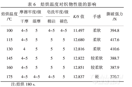 從表6中可知,115℃焙烘時,各種牢度都較理想,但K/S值較低;130℃焙烘時,摩擦牢度和K/S值都很好;但焙烘溫度過高,會對織物造成一定的損傷,織物強力下降,手感也變差.因此,選擇焙烘溫度為130℃.