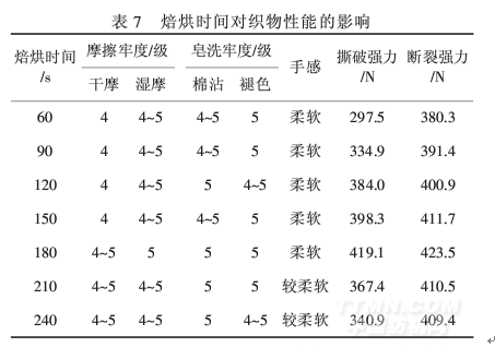 從表7可知,隨著焙烘時間的延長,織物的摩擦牢度、皂洗牢度上升,但超過180 s后,各項牢度并沒有明顯提高,織物強力卻有所下降,手感也變差.綜合考慮,選擇焙烘時間為180 s.