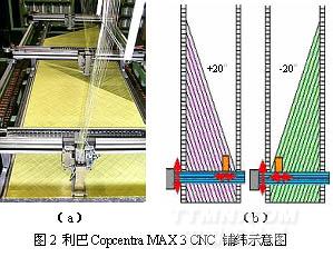 利巴公司的Copcentra MAX 3 CNC型機(jī)器的所有功能均為電腦控制;織針機(jī)件以外的所有運(yùn)動(dòng)均由伺服電機(jī)驅(qū)動(dòng);織物的各種變化,尤其是鋪層角度的調(diào)整,均由中央電腦控制。在鋪緯方式方面,兩公司的機(jī)器略有不同。利巴機(jī)器的鋪緯是由鋪緯滑軌運(yùn)動(dòng)、傳輸鏈運(yùn)動(dòng)、鋪緯小車運(yùn)動(dòng)三者的合成,如圖2所示,只需改變?nèi)叩乃俣染湍鼙容^方便地改變鋪緯角度。而卡爾邁耶機(jī)器是通過(guò)傳輸鏈運(yùn)動(dòng)和鋪緯小車運(yùn)動(dòng)的合成來(lái)形成所需的角度,在角度變換時(shí)還需對(duì)導(dǎo)軌進(jìn)行機(jī)械操作,比較費(fèi)時(shí)。此外,利巴機(jī)器每一紗層的運(yùn)動(dòng)完全可以通過(guò)程序設(shè)計(jì)在-20°到+20°之間變化,這與卡爾邁耶的-45°到+45°相比有所改進(jìn),機(jī)器的標(biāo)準(zhǔn)傳送架可以生產(chǎn)兩個(gè)45°襯緯和一個(gè)90°襯緯,也可按需要進(jìn)行長(zhǎng)度延伸,延伸后的傳送架最多可襯入7層襯緯紗,1層襯經(jīng)紗,1層纖維網(wǎng)。同時(shí),利巴機(jī)器還采用了其獨(dú)特的移動(dòng)復(fù)合針系統(tǒng)(圖3),使得復(fù)合針除了在垂直上下運(yùn)動(dòng)外,還在水平方向(即織物喂入方向)運(yùn)動(dòng),從而減少了編織過(guò)程中織針的負(fù)荷;減少了織針與紗線的摩擦;減少了穿刺造成孔洞的可能性,在很大程度上提高了織物的生產(chǎn)效率,改善了織物的質(zhì)量。據(jù)報(bào)道,利巴公司已成功推出了用于碳纖維生產(chǎn)的Copcentra MAX 5 CNC Carbon機(jī)型。由于碳纖維在織造過(guò)程中易產(chǎn)生具有導(dǎo)電性的碳粉,會(huì)導(dǎo)致機(jī)器及生產(chǎn)環(huán)境中的帶電設(shè)備爆炸等危險(xiǎn)情況發(fā)生,因此該類多軸向經(jīng)編機(jī)帶有特殊的密封裝置,其造價(jià)達(dá)到2800多萬(wàn)人民幣,是普通多軸向經(jīng)編機(jī)的三倍。在生產(chǎn)過(guò)程中,碳纖維增強(qiáng)紗線的鋪緯角度可以在-45°、90°、+45°、0°等角度之間變化,鋪緯層數(shù)和原料規(guī)格也可以自由選擇,織物品種較豐富。