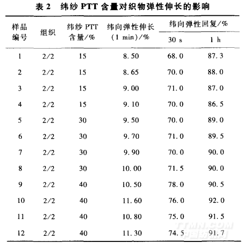 緯紗PTT含量對(duì)織物彈性伸長(zhǎng)的影響見表2。