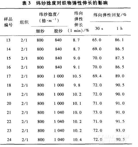 毛紗(細(xì)紗/股紗)捻度變化對(duì)織物彈性伸長(zhǎng)的影響見表3。由表3可以看出,捻度大的織物伸長(zhǎng)和回復(fù)好。PTT纖維混紡毛紗的捻度比常規(guī)捻度高 出40~80捻/m,對(duì)織物的彈性改善比較大。