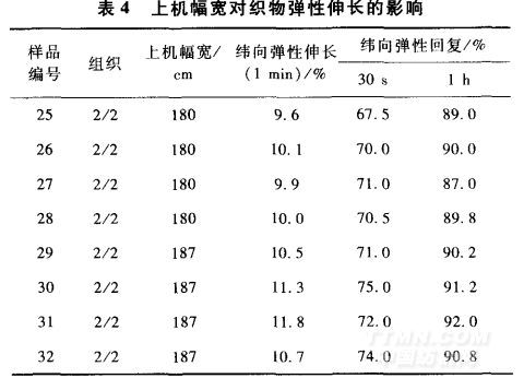 上機(jī)幅寬對(duì)織物彈性伸長(zhǎng)的影響見表4。