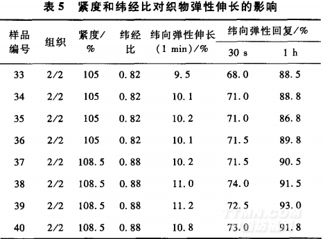 在其他參數不變的情況下,組織結構對織物的緯向彈性影響比較大。平紋組織,單面嗶嘰2/1,雙面組織2/2,2/2變化組織對織物彈性伸長的影響見表6。由表6可以看出,結構較松及長浮線織物,緯向伸長和回復率比較好…。