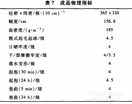 成品物理指標數據見表7。 成品各項指標符合日本檢測項目標準,產品的實物質量,尤其是彈性、懸垂性比較理想。