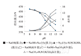 圖1不同堿劑、不同pH對織物經向強力和染色K/S值的影響