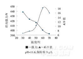 圖3溫度對織物經向強力和K/S值的影響
