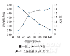 由圖3知,隨著處理溫度的升高,強力損傷增大,染色K/S值先增大后減小.原因是絲織物在高溫堿性條件下損失越大;另外,隨著溫度的升高,染料分子的運動能力得到了增強,從而使染料在織物上的擴散系數得到了提高,染料聚集體解聚越容易.[4-5]染料的上染量得到提高,織物的K/S值也就隨著溫度的提高而增加.>60℃時,K/S值下降,原因是染料隱色體對纖維的親和力降低.還原紫2R上染真絲最適宜的染色溫度為50℃,此時織物經向強力為410.27N,強力損失率為13.69%,K/S值為10.35.