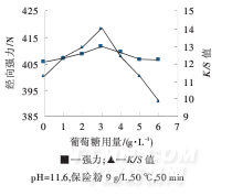 圖5葡萄糖用量對織物經向強力和K/S值的影響