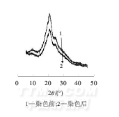 由圖6可知,2θ=20.4°為真絲纖維的結晶特征峰.通過比較發現,染色前后X-衍射峰的位置基本沒有變化,且染色前后結晶度分別為48.88%、48.84%(結晶度相差不大).說明染色前后絲纖維的結構基本沒有改變,晶區未受影響.