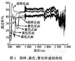 從圖6中可以看出,在紫外線UVB和UVA波 段,紫色和黃色樣與原樣相比透過率值顯著降低,其 中黃色樣降低最為明顯。黃色樣在UVB波段正面 透過率為6.67 ,比原樣減少了6.56 ,反面為 8.20 ,比原樣減少了7.43 ;UVA波段正面為 16.06 ,比原樣減少了21.16 ,反面為19.O9 , 比原樣減少了26.96 ,說明染色后織物紫外線的 防護性能有很明顯的提高。在VIS和NIR波段紫 色樣和黃色樣透過率值比原樣要減少,但與紫外線 波段相比下降幅度較小。在VIS波段黃色透過率 下降幅度比紫色小,其正面透過率為34.66 ,反面 為39.62 ,說明采用黃色對透過率影響較小,透光 性能比紫色的好。