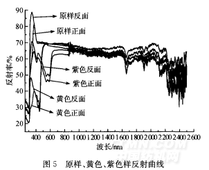 為了測試染色后對窗簾透光、隱視功能的影響,本實驗按不同色系分別試染了黃色、紫色兩種顏色 的面料,對織物透過率和反射率進行測試,結(jié)果如圖4、圖5所示。并對其光學(xué)性能與原樣進分析對比。