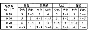 表1皂洗酶質量濃度對不同顏色的色牢度影響色牢度/級