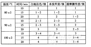 對深藍(lán)色印花毛巾采用0.20g/L皂洗酶,測定不同皂洗溫度和時(shí)間下的白地沾色牢度、水洗牢度和濕摩擦牢度,見表2。