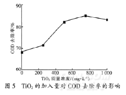 另外,由圖5可知,當TiO2投加質量濃度達到750mg/L時,染料廢水COD去除率達到最大,為85%,而當TiO2投加質量濃度>750mg/L時,COD的去除率基本恒定在85%左右,甚至有下降的趨勢。這是因為當TiO2加入量較少時,隨著其濃度的增加,在超聲波作用下,TiO2對超聲的輔助作用逐漸增加,所以COD去除率有上升的趨勢。但當TiO2加入量超過一定值時,一方面由于超聲功率一定,在一定時間內能夠激發TiO2使其產生空穴的絕對數量也一定,因此在宏觀上的表現就是隨著TiO2投加量持續增加,COD去除率保持恒定。另一方面,由于過多的TiO2晶體之間存在相互屏蔽超聲波的作用,這會導致超聲波利用效率的降低,因此從宏觀上表現為COD去除率的略有下降趨勢。