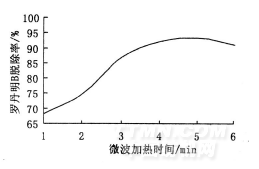 從圖3看出,當微波功率一定時,復合催化材料的催化效果隨著微波加熱時間的增加而增大。但超過5min后,復合催化材料對羅丹明B的脫除率反而逐漸變小。這可能是微波輻射的時間越長,整個反應體系的溫度越高,在較高溫度下二氧化鈦溶膠顆粒可能與膨脹珍珠巖中的Na+、K+、Mg2+等金屬離子形成鈦酸鹽,這些金屬離子的鈦酸鹽是光生電子和空穴的復合中心,加快了光生電子和空穴的復合,導致TiO2/EP復合催化材料的催化活性下降。因此確定微波輻射時間不能太長,以5min為佳。