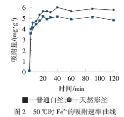 測出Fe2+吸附普通白絲和天然彩絲的速率曲線,結果如圖2所示.