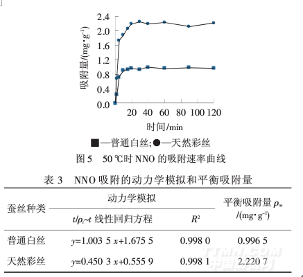 天然彩絲和普通白絲對Fe2+和酸性橙Ⅱ的吸附規律都可以用Langmuir吸附模型近似描述,天然彩絲和普通白絲對表面活性劑NNO的吸附規律不能完全符合某種吸附等溫線.當吸附達到平衡后,天然彩絲對Fe2+、NNO和酸性橙Ⅱ的平衡吸附量高于普通白絲.