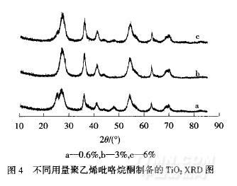 由表3可知,加入0.6%的聚乙烯吡咯烷酮制得的納米TiO2,4h對甲基橙降解率達到了80.3%,降解甲基橙的效果最好,可能原因是加入0.6%的聚乙烯吡咯烷酮得到的TiO2晶粒尺寸比未加分散劑小.大多數加24印染助劑28卷入分散劑后對甲基橙的降解率還有一定程度的降低,原因是分散劑在納米TiO2表面形成一定的包覆層,降低了納米TiO2與甲基橙的接觸概率,從而降低了對甲基橙的降解率.因此,分散劑用量選擇0.6%.