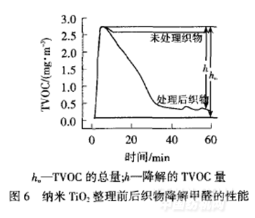 以理解為不是納米TiO2光催化降解甲醛導致的結果.但是經納米TiO2處理后的織物,曲線下降很快,原因是納米TiO2的光催化作用,對甲醛進行降解,使甲醛用量降低,50min后逐漸趨于平衡.60rain后經納米TiO2處理的織物對甲醛的降解率達到88.1%.