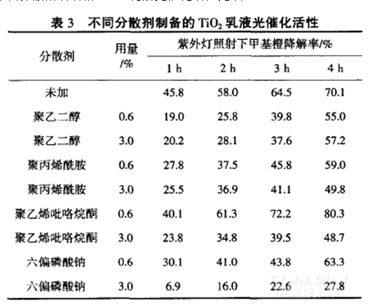 不同分散劑制備的TiO2乳液光催化活性見表3