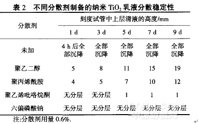 文獻[9—11]介紹,PEG和六偏磷酸鈉能提高納米TiO2的分散穩定性.由表2可看出,在納米TiO2乳液中加入分散劑能明顯改善其分散穩定性,其中六偏磷酸鈉效果最好,幾乎沒有分層現象.