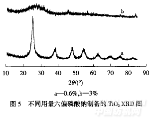 從圖5和表1可知,六偏磷酸鈉用量為0.6%時,納米TiO2吸收峰基本符合銳鈦礦型,不含金紅石型;提高六偏磷酸鈉用量,產物晶型變成了無定形.