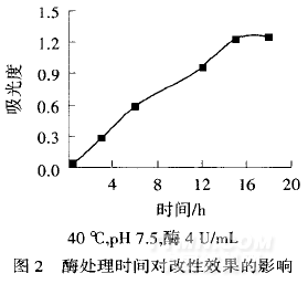 由圖2可以看出,反應初期,隨著時間的延長,反應殘液的吸光度迅速增~u;15h后,繼續延長反應時間,吸光度變化趨于平緩.原因是隨著反應時間的延長,被脂肪酶催化水解的酯鍵數目增多,殘液中生成的乙酸量也隨之增大.而在反應進行到后期(15h后),醋酸纖維表面可供水解的酯鍵數量越來越少.另外,隨著反5期葉若銘,等:脂肪酶Lipex100L對醋酸纖維改性工藝探討41應時間的延長,酶活逐漸下降,加之可能的產物抑制作用,催化效率也會降低.