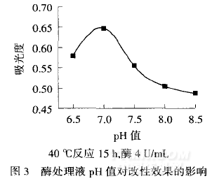 由圖4可知,隨著反應體系溫度的升高,反應殘液的吸光度先增大,將溫度逐漸升至40℃附近時,吸光度開始下降.原因是溫度對酶的活力有雙重影響:(1)溫度升高可使酶的催化反應速率加快;(2)過高的溫度會促使酶蛋白變性,導致酶活力降低甚至完全喪失.