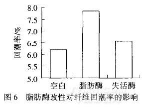 由圖6可以看出,脂肪酶處理后醋酯纖維的回潮率明顯增加,原因是酯基的水解使纖維表面的親水性羥基數(shù)量增加.而失活酶處理后纖維回潮率也稍有增加,原因是一定量的酶蛋白吸附在纖維表面.