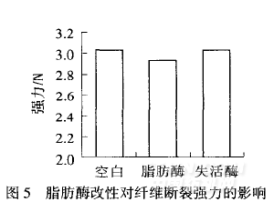 由圖5可知,脂肪酶處理樣、失活酶處理樣與空白樣相比強力均有下降,其中脂肪酶處理樣的強力較空白樣下降8%,而失活酶處理樣的強力只發(fā)生微小改變.原因是酶對纖維的催化水解作用在一定程度上破壞了纖維的結構,但纖維發(fā)生水解的酯鍵位于分子側鏈,大分子主鏈結構基本不發(fā)生變化,且水解僅發(fā)生在纖維表面,因此,酶處理后纖維強力變化較小.