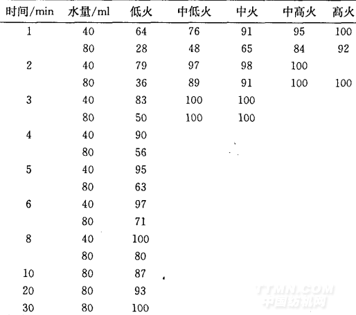 由表1中數據可知,加熱相同時間時微波爐火力 越大水溫越高,若采用中火以上火力,水溫很快就會達 到100℃;需要加熱的水量越大,水溫達到100℃所需 時間越長。因此,采用微波進行染整加工時,必須根據 液體的體積選擇合適的微波火力及加熱時間。 實驗中發現,微波功率越大,水分揮發越快,越容 易過早使織物暴露于水面之上,造成織物處理不勻或 強力下降;采用中低火加熱7 min、中火加熱6 min后 (沸騰后計時)40 mL水就近乎蒸發完畢。另外,由于低 火升溫速度慢,水浴加熱沸騰所需的時間長,因此,綜合考慮本實驗采用中低火(280 w)進行微波加熱實驗。