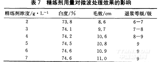 純棉坯布2 g,燒堿15 g/L,過氧化氫10 g/L ,FCB 2 g/L,浴比1:20,中低火處理5 min,精煉劑MRN的影響如表7所示。由表7知,精練劑用量主要是影響織物的退漿等級和毛效,其用量在5 g/L即可。